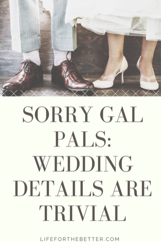 How do we lose sight of the marriage itself? And why isn’t there a legit sequel to Cinderella where the Prince and Cindy plan for their careers? Cause let’s be honest, she could probably start a pretty successful cleaning business right off the bat. Did they map out a general idea of their life together, decide what religion they’d practice (if any), and prepare for retirement before the big day? (Okay, actually that last one doesn’t apply because retirement is probably becoming king and queen. Scratch that.)